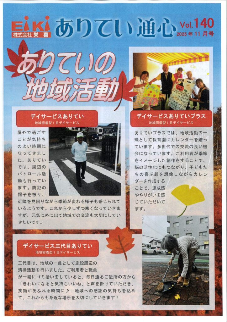 ありてい通心140号をアップロードしました。 紅葉が楽しみな季節になりました。 ありていでは地域の一員として、交流を楽しみながら地域活動に取り組んでいます。
