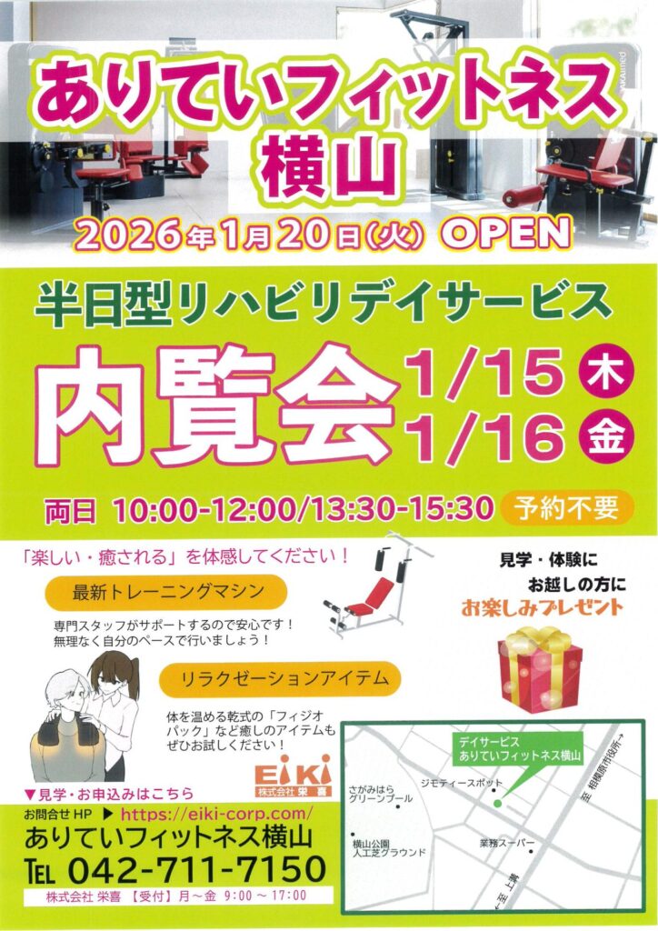 ありていフィットネス横山【内覧会】のお知らせ コメントする / お知らせ / By 株式会社栄喜 「ありていフィットネス横山」の開設に向けて内覧会を開催致します。1月15日(木)10:00~12:00 13:30~15:301月16日(金)10:00~12:00 13:30~15:30みなさまのお越しをお待ちしております!!